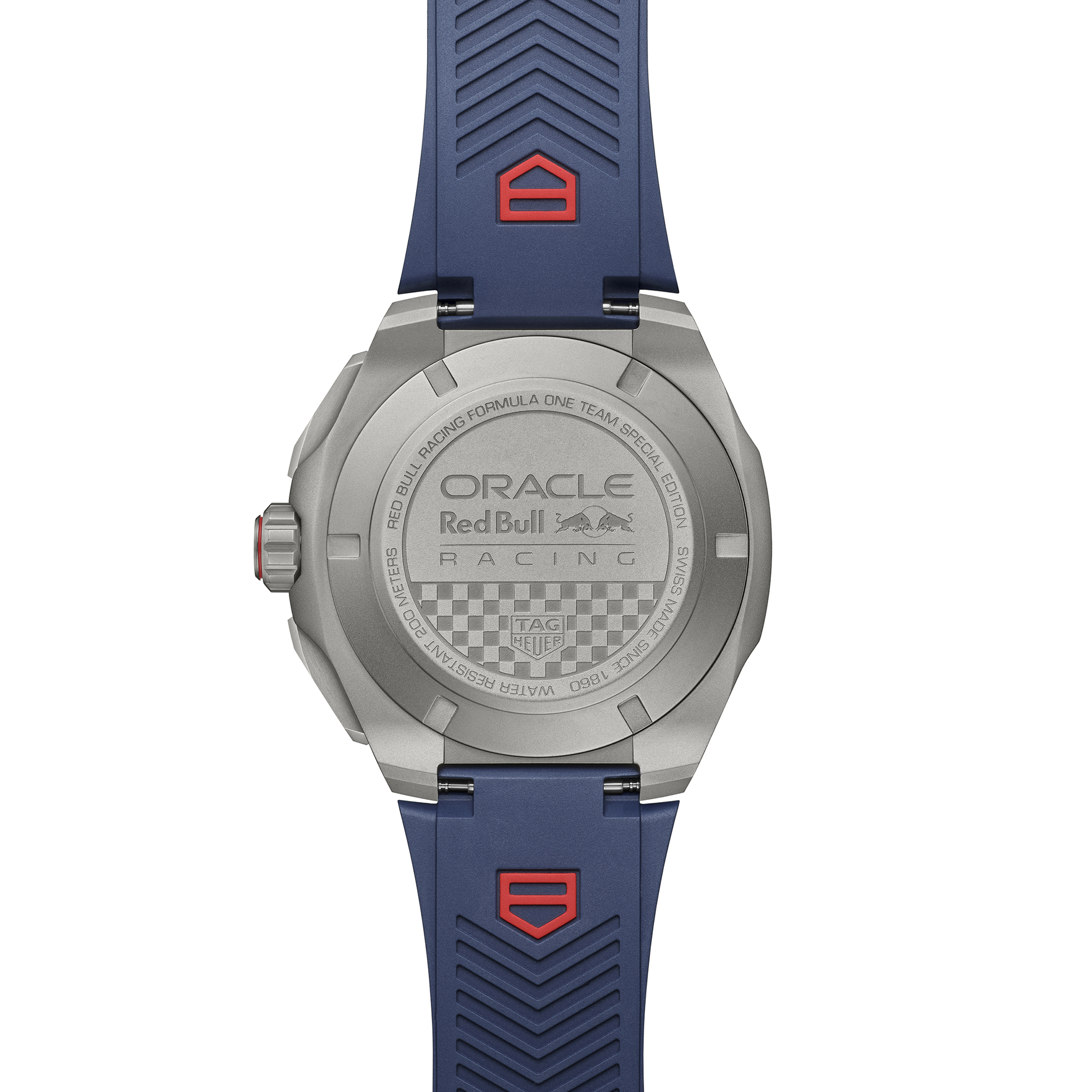 Flipping the watch reveals its final tribute to the world of racing: a caseback engraved with the Oracle Red Bull Racing and TAG Heuer logos, set against a checkered flag motif—the timeless symbol of victory. This engraving reflects the shared pursuit of excellence, precision, and relentless performance.