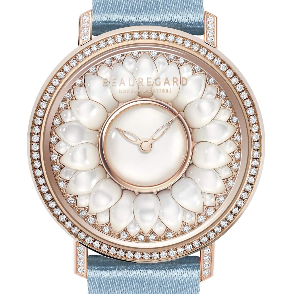 Chaque pétale de notre Lili est serti de manière invisible et patiemment poli à la main, ce qui en fait un bijou à part entière et un composant irrepassable du jardin miniature de pierres précieuses qui en fleuri le cadran.