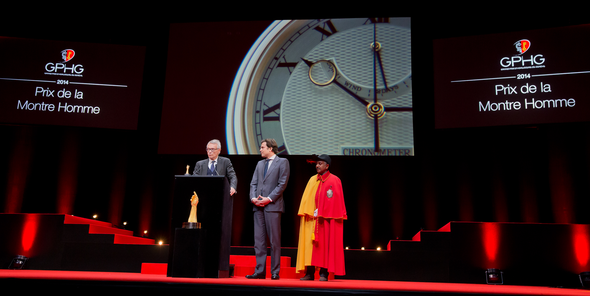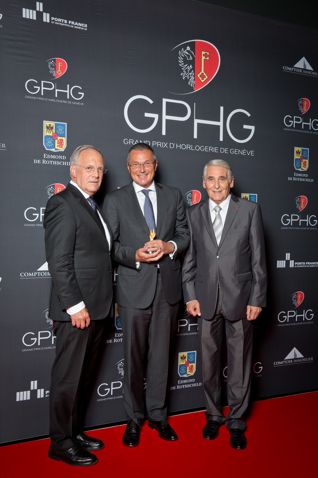 Johann Schneider-Ammann (Federal councillor), Jean-Charles Zufferey (Vice-president of Breguet, winner of the « Aiguille d’Or » Grand Prix 2014) and Carlo Lamprecht (President of the Foundation of the GPHG)