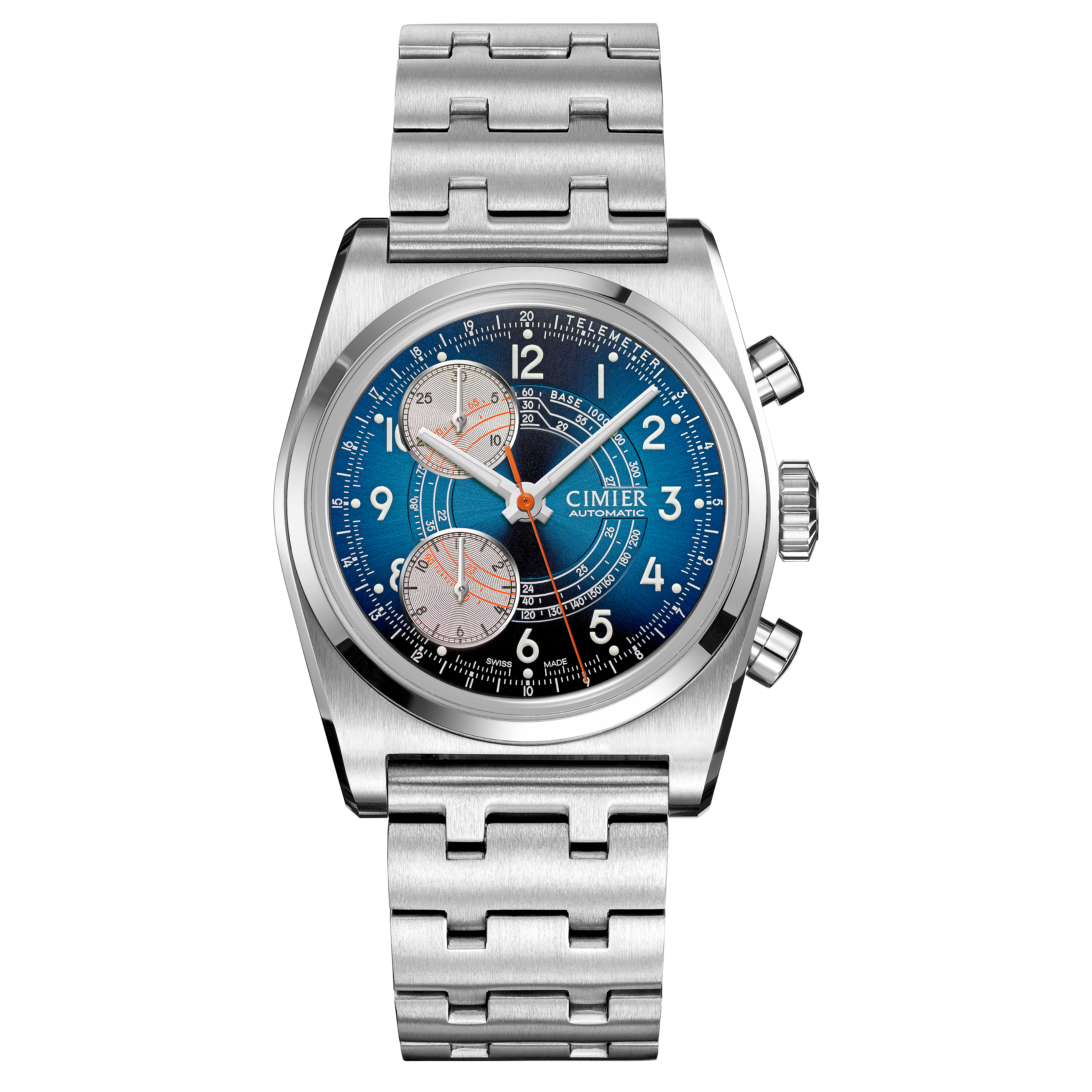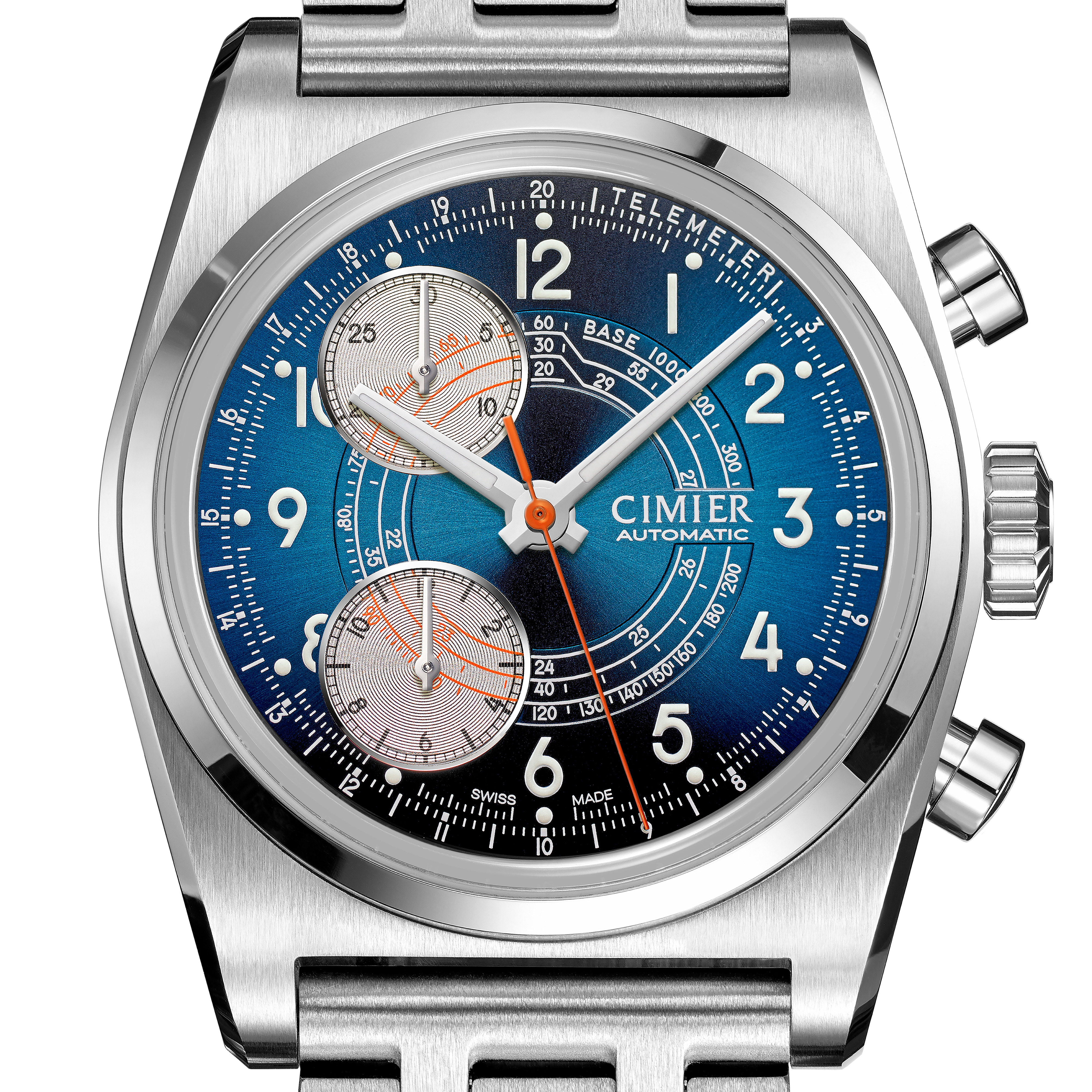 Le cadran de la "Cimier 711 Heritage Chronograph" se distingue par la disposition inhabituelle des compteurs chronographes de 30 minutes et 12 heures à 11 et 7 heures. Typique d'une "Cimier Sport" des années 1960, une échelle télémétrique est également placée sur le bord extérieur du cadran et une échelle tachymétrique est placée au centre pour apporter une touche vintage supplémentaire. La première permet de mesurer la distance en fonction de la vitesse du son, et la seconde permet de mesurer la vitesse en fonction du temps et de la distance. Le cadran est composé de deux plaques et est proposé en bleu foncé soleillé. Tout comme les aiguilles facettées, les marqueurs d'heures sont composés de Super-Luminova®, appliquée à la main avec soin.