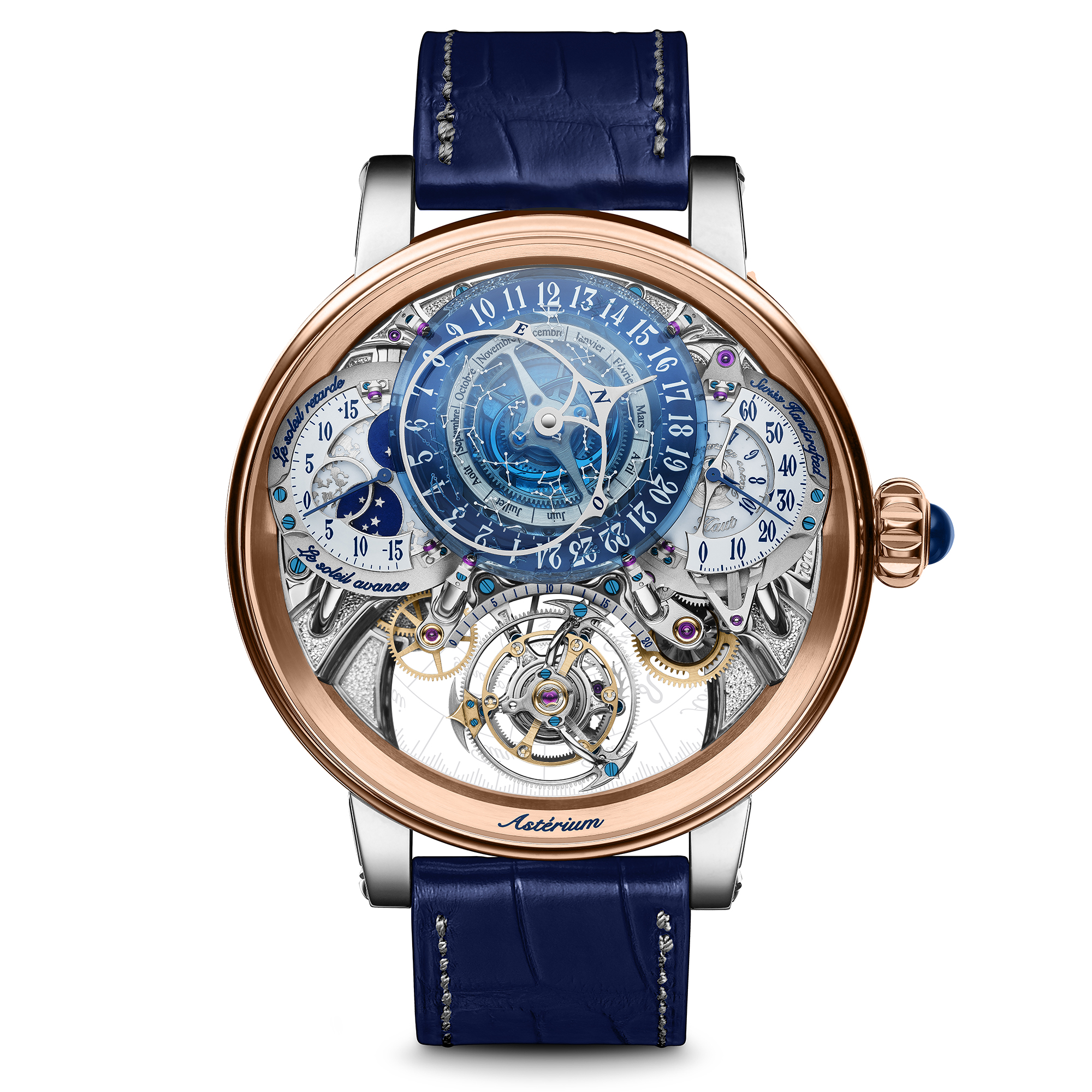 Avec son boîtier « écritoire » signature de la Maison, l’Astérium, pièce unique associant or rouge et or blanc 18 carats, met son mouvement spectaculaire au centre de la scène, et quel mouvement !