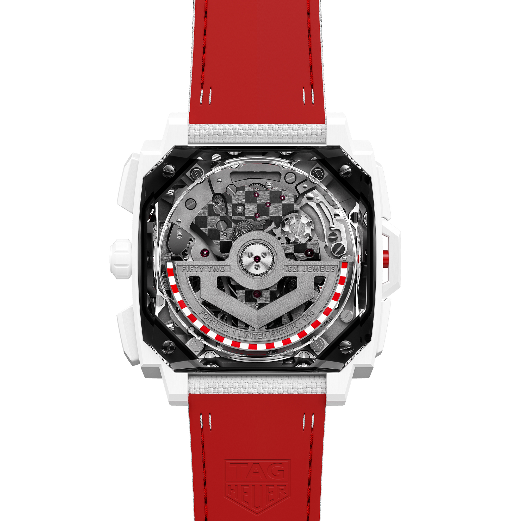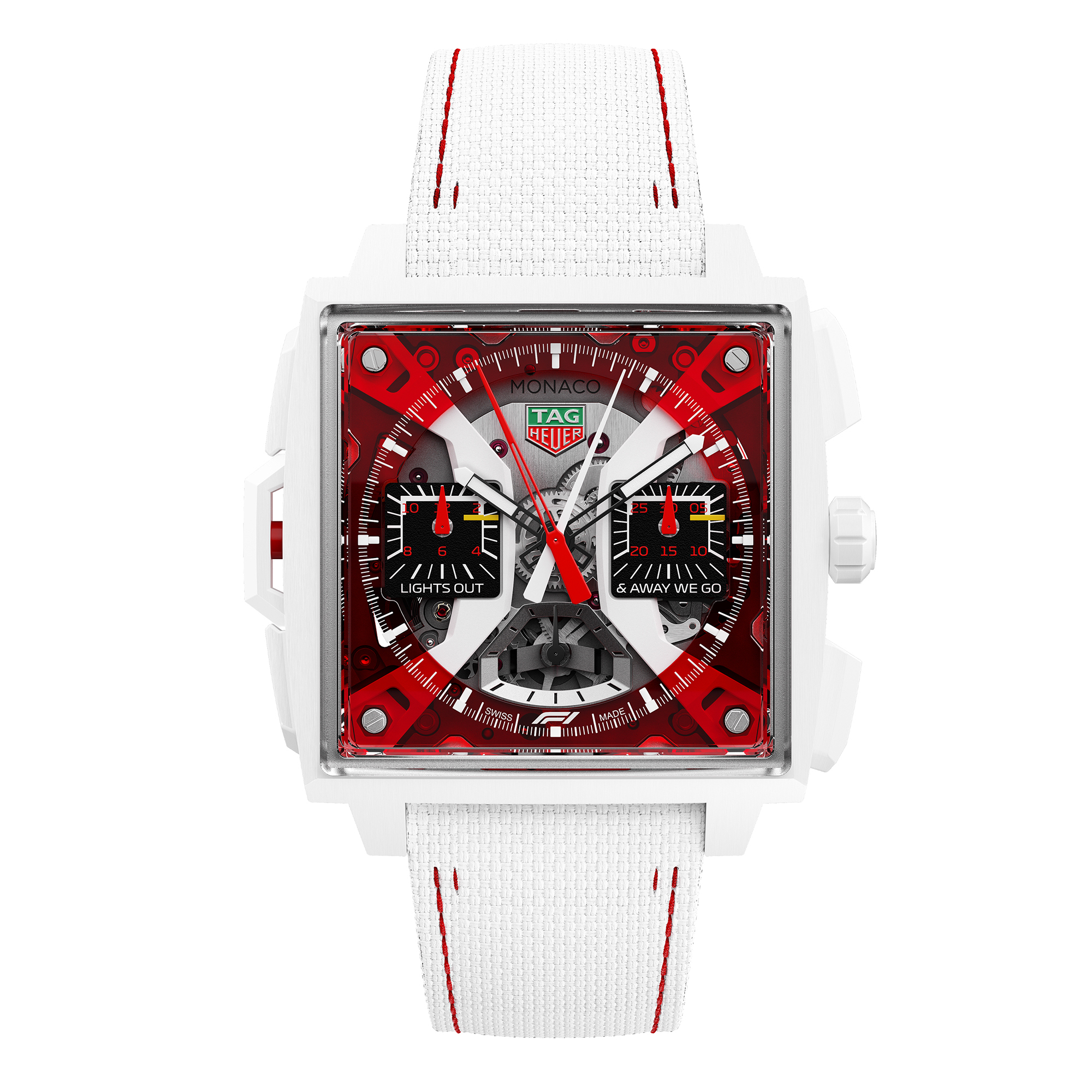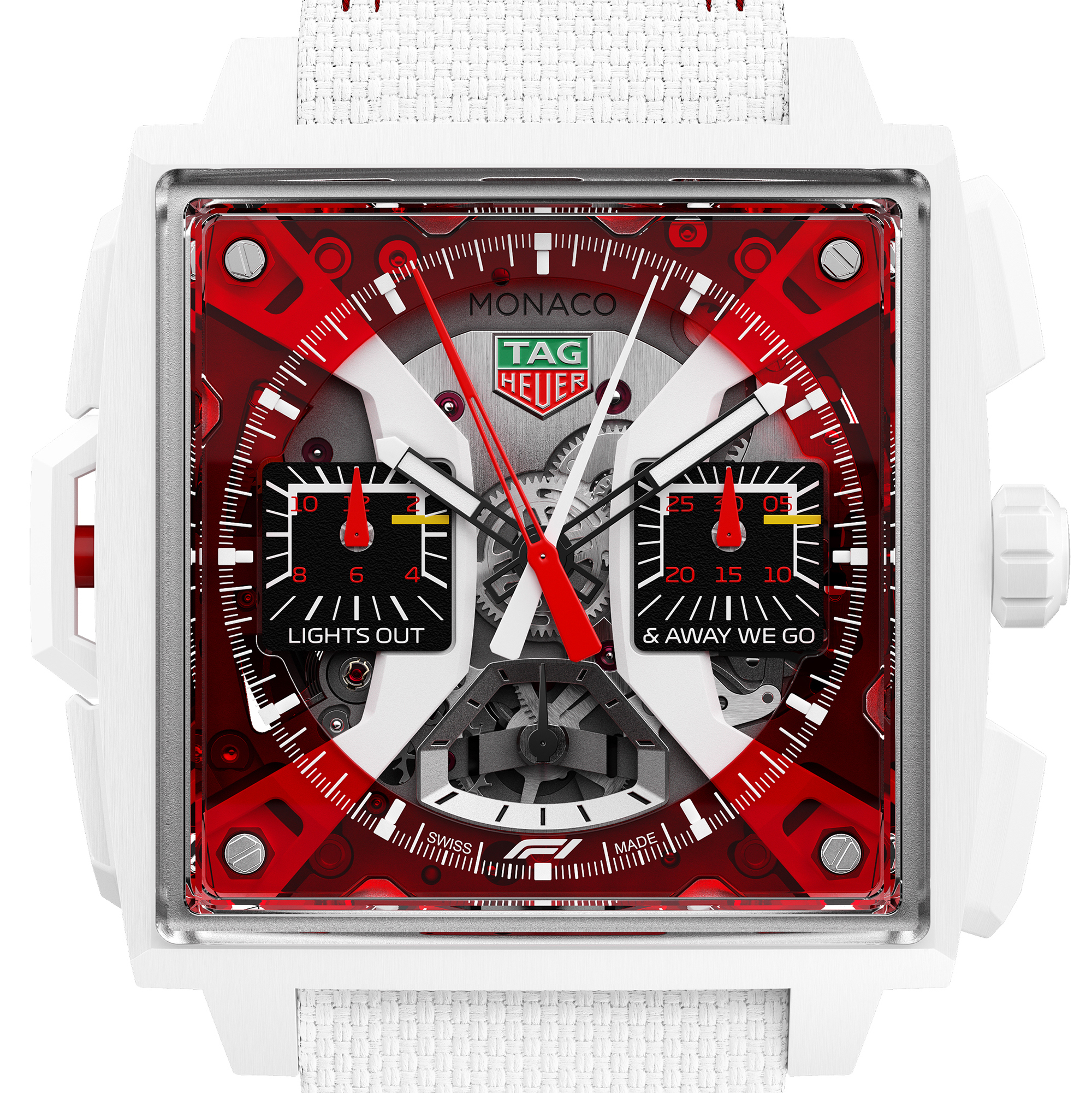Pour commémorer ce partenariat historique, TAG Heuer a dévoilé une nouvelle version de son garde-temps le plus complexe : la Monaco Split-Seconds Chronograph I F1®, dans une édition limitée à seulement 10 exemplaires. Inspirés par les couleurs emblématiques de la Formule 1®, le boîtier, la couronne et les poussoirs en céramique blanche reflètent les lignes aérodynamiques d'une voiture de course. Chaque détail évoque le savoir-faire et la technique synonymes de l'ingénierie de la Formule 1®. Un cadran translucide rouge capture l'adrénaline du jour de la course. Les compteurs du chronographe s'inspirent du design des circuits, avec une finition asphaltée, des positions de grille de départ blanches et jaunes et la typographie officielle de la F1. Les compteurs comportent également la phrase rendue célèbre par le commentateur britannique David Croft : "LIGHTS OUT & AWAY WE GO".