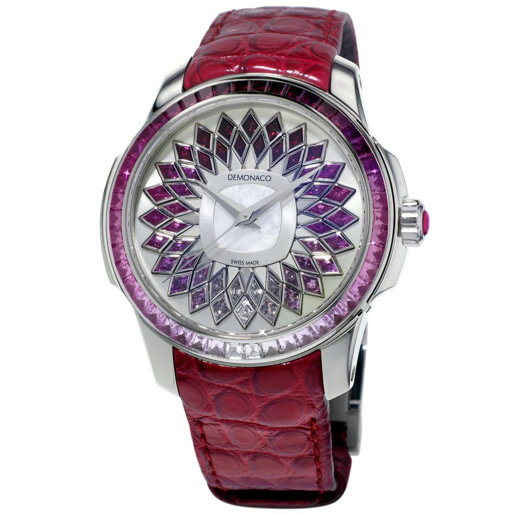 La Sirène Rubis is decorated with three different stones: the Ruby, the Sapphire and the Diamond, which give impression of a red rainbow. The bezel is set with 16 baguette cut rubies, 28 baguette cut sapphires and 2 baguette cut diamonds. Following the same colour shading, the dial embraces 24 rubies, 21 sapphires and 3 diamonds set in flower pattern. In order to highlight this masterpiece, the crown is decorated with one ruby and the strap is as red as the ruby stones.